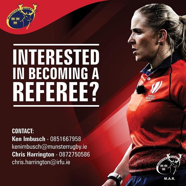 To get involved, contact Olly Hodges, the Referee Development Manager for Munster, at olly.hodges@irfu.ie or 086-8596289. You can also find more information on the Munster Rugby website.